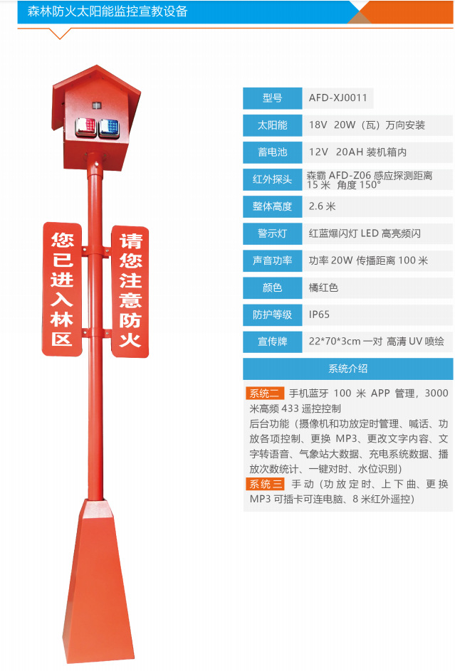 5、语音中控系统,手机APP软件100米系统控制,遥控器3000米操作控制,主板工作电压7V-36V宽电压带防反接保护,支持远程喊话,支持双方对讲,支持SOS紧急报警求助,支持单、双信号触发语音,支持功率8欧10瓦,支持4欧30瓦通过拨码开关设置,音频文件支持2G内存芯片存储,支持TF卡存储可热插拔,支持U盘播放,支持看门狗开箱防盗报警,支持采集环境因子大数据,支持采集气象信息大数据,支持采集太阳能控制器数据,支持二次开发,支持485协议,支持TTL协议,手机APP软件功能《LED修改文字,文字转语音合成男女声可选,手机上传音频文件到主板,手机一键对时,主板文件管理,摄像机重启管理,播放语音定时管理,数据刷新管理,解除看门狗报警,控制铅酸电池和锂电池充电转换,查看气象站大数据信息,查看环境因子数据,监测土壤环境,查看发电供电系统数据,查看电池类型,设置单曲循环,多曲循环,上曲下曲,音量+ -,暂停,插放》,遥控器3千米控制,一键定时,单曲循环,多曲循环,上曲下曲,音量+ -,暂停,插放。6、户外高亮度12v2A红蓝警示灯,快闪,慢闪,爆闪,交替闪,亮灯时长受中控系统控制和音频同步。
